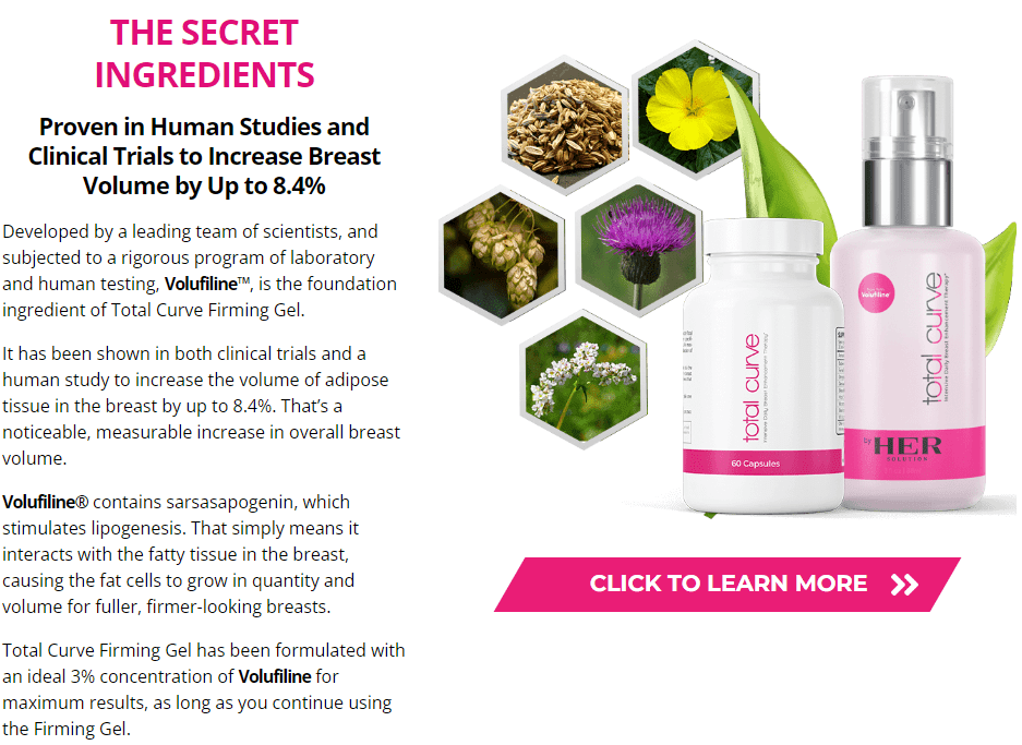 The secret to the Total Curve success story is its revolutionary two-part system.More than just a lotion, cream or another daily vitamin, Total Curve is a complete breast enhancement therapy program. It works both internally and externally to help tone and reshape your breasts for a more youthful appearance.
