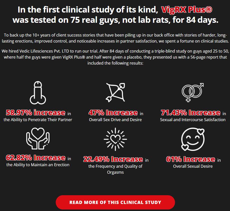 It's simple – VigRX Plus is one of the ONLY natural formulas available that has been clinically tested with proven results and a doctor recommendation. This is a big deal because 99% of “enhancement” products are too scared to put their money where their unproven claims are.