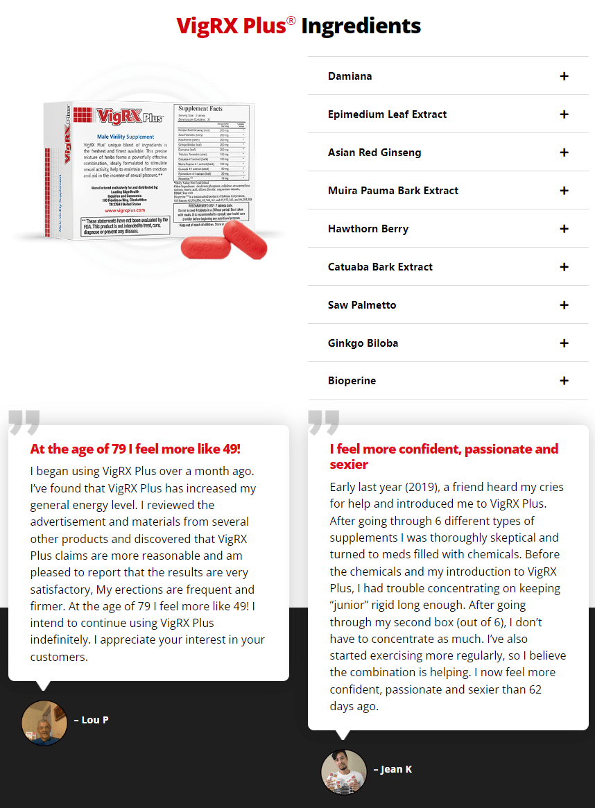 “A must buy supplement! I bought VigRX because I wanted a stronger erection. Oh and did it deliver! My wife definitely told me that my penis is bigger. This definitely helps with the blood flow of maximizing your erection and sustaining it. I have not experienced any bad side effects.”